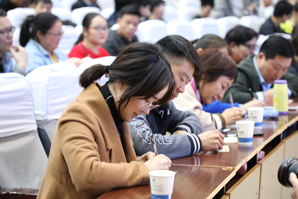 “业精于勤,荒于嬉。”在主持人的倡导下,现场师生诵读国学经典,感悟中华美德的真谛与内涵。品德环节,与会人员争相发言,结合张龙老师的主题宣讲内容分享了自己的感受和体会。传德环节,大学生艺术团表演了歌舞《我们都是追梦人》,beat365官方唯一网站学子向张龙老师敬献鲜花以表达谢意和敬意。润德环节,与会人员将现场亲笔书写的留言卡投入爱心箱中。