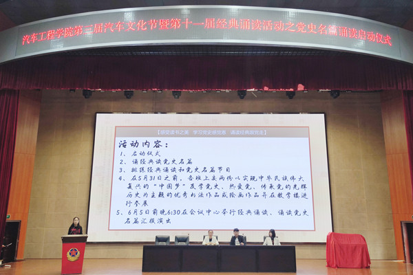 张玲致开幕词,她鼓励同学们保持“天行健,君子以自强不息”的奋斗精神,练就“宝剑锋从磨砺出”的过硬本领,锤炼“行有不得,反求诸己”的品德修为,锻造正确的人生观、价值观、世界观,争做“志存高远、德才并重、情理兼修、勇于开拓”的新时代优秀青年。副书记梁军萍介绍了第三届汽车文化节系列活动情况并作出具体安排和明确要求,20级辅导员曲杉对经典和党史名篇诵读发出倡议,学生代表李紫辉为践行此次活动的规则宣誓。