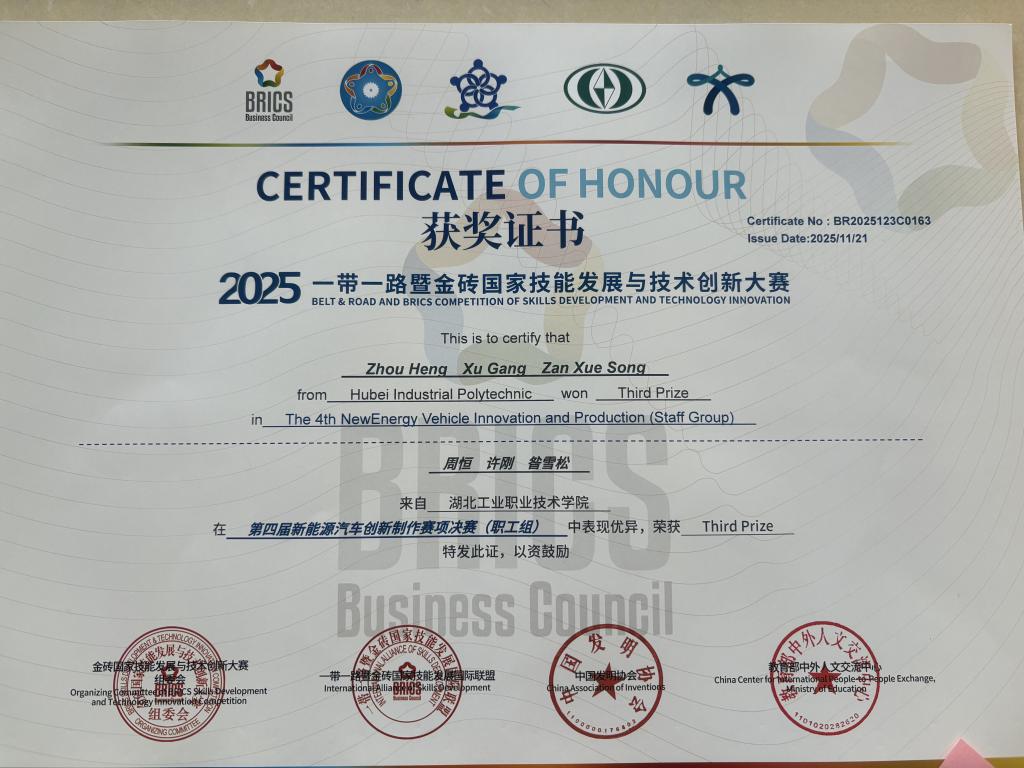 (通讯员:周恒)近日,在山东省济南市举办的2025一带一路暨金砖国家技能发展与技术创新大赛第四届新能源汽车创新制作赛项决赛圆满落幕。由beat365官网beat365官方唯一网站周恒、许刚、昝雪松三位教师组成的参赛队伍在全国众多参赛队伍中凭借扎实的专业技能和稳定的临场发挥脱颖而出,获得教师组三等奖。