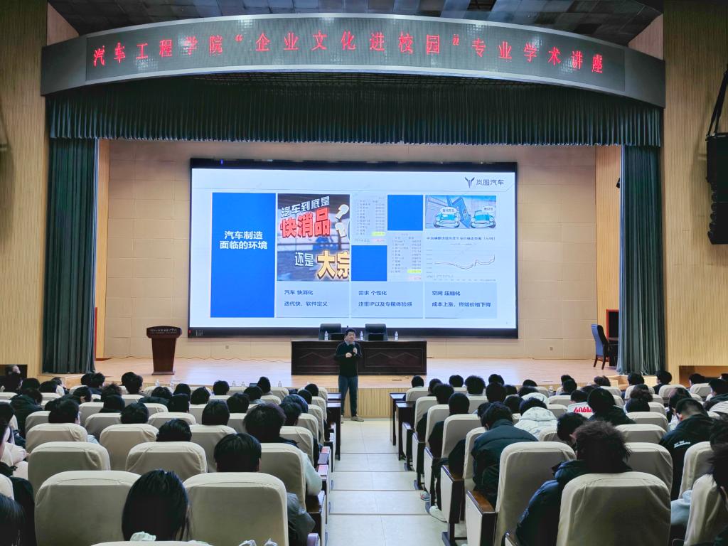 首场讲座围绕“汽车未来发展趋势”主题,由拥有18年汽车制造领域工作经验的岚图内训师付浩担任主讲。他结合未来生产模型与行业典型案例,系统阐述了汽车产业由燃油向新能源、由机械化向智能化网联化转型的技术路径与市场前景,剖析了技术革新对产业链及人才能力提出的新要求,为师生理解行业前沿、把握学习方向提供了权威视角。