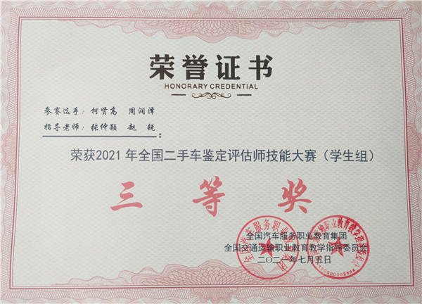 新闻网讯(通讯员 张玲 张仲颖)7月4日,2021年全国二手车鉴定评估师技能大赛(学生组)在浙江交通职业技术学院圆满闭幕。经过二手车鉴定评估实操和二手车理论考试两轮的激烈角逐,beat365官网beat365官方唯一网站2019级“一汽-大众订单班”柯贤高、周润泽同学克服备赛时间短、天气炎热、实训车辆缺乏等困难,凭借扎实的基本功在众多院校选手中脱颖而出,获得全国三等奖的好成绩。